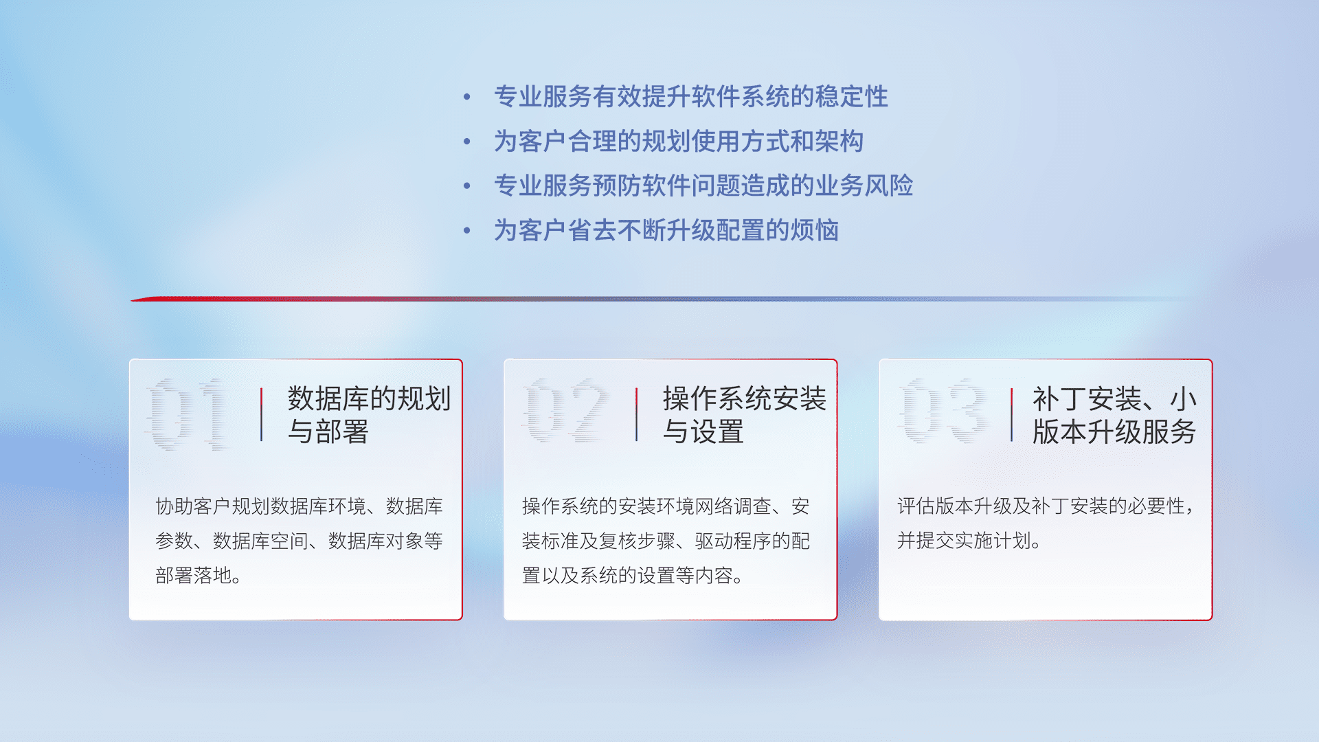 为客户提供软件规模升级、、、、快速部署、、、、按需配置的专业服务,,从数据库的规划与部署到操作系统的安装与设置,,,,再到补丁安装和小版本升级提供支持。。。。